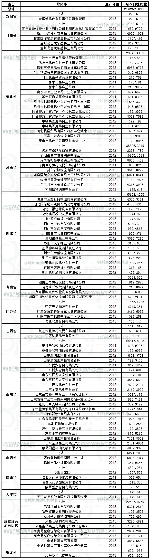 各紡織企業(yè): 定于8月27日出庫(kù)銷售儲(chǔ)備棉214257.0233噸。其中2011年度國(guó)產(chǎn)棉15252.5252噸,2012年度國(guó)產(chǎn)棉149700.4058噸,2013年度國(guó)產(chǎn)棉49304.0923噸。相關(guān)批次公檢數(shù)據(jù)見(jiàn)附件,具體庫(kù)點(diǎn)如下: