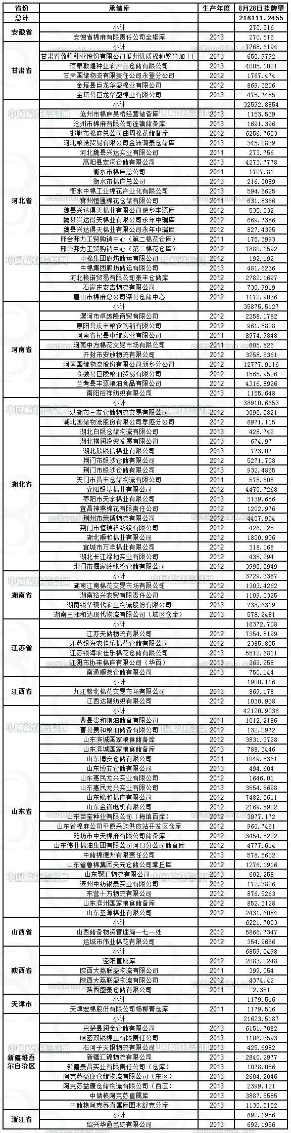 定于8月28日出庫銷售儲備棉216117.2455噸。其中2011年度國產(chǎn)棉16587.7964噸,2012年度國產(chǎn)棉141113.9521噸,2013年度國產(chǎn)棉58415.497噸。相關(guān)批次公檢數(shù)據(jù)見附件,具體庫點如下: