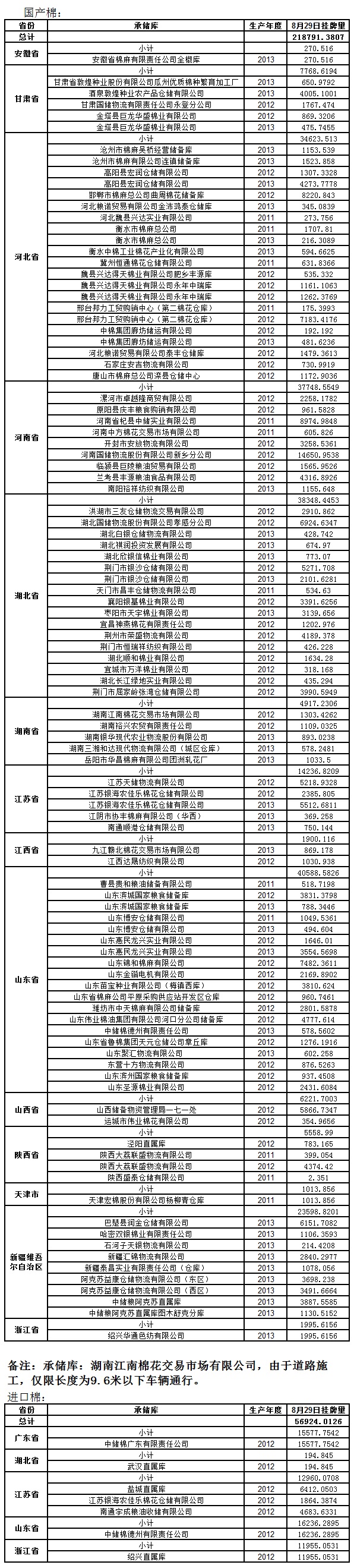 各紡織企業(yè): 定于8月29日出庫銷售儲備棉275715.3933噸。其中國產(chǎn)棉218791.3807噸,進(jìn)口棉56924.0126噸。相關(guān)批次公檢數(shù)據(jù)見附件。具體庫點如下: