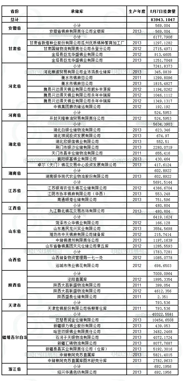 各紡織企業(yè): 定于8月7日出庫(kù)銷售儲(chǔ)備棉83943.1047噸。其中2011年度國(guó)產(chǎn)棉3150.3666噸,2012年度國(guó)產(chǎn)棉22380.5326噸,2013年度國(guó)產(chǎn)棉58412.4055噸。今日無(wú)進(jìn)口棉。相關(guān)批次公檢數(shù)據(jù)見(jiàn)附件。具體庫(kù)點(diǎn)如下:
