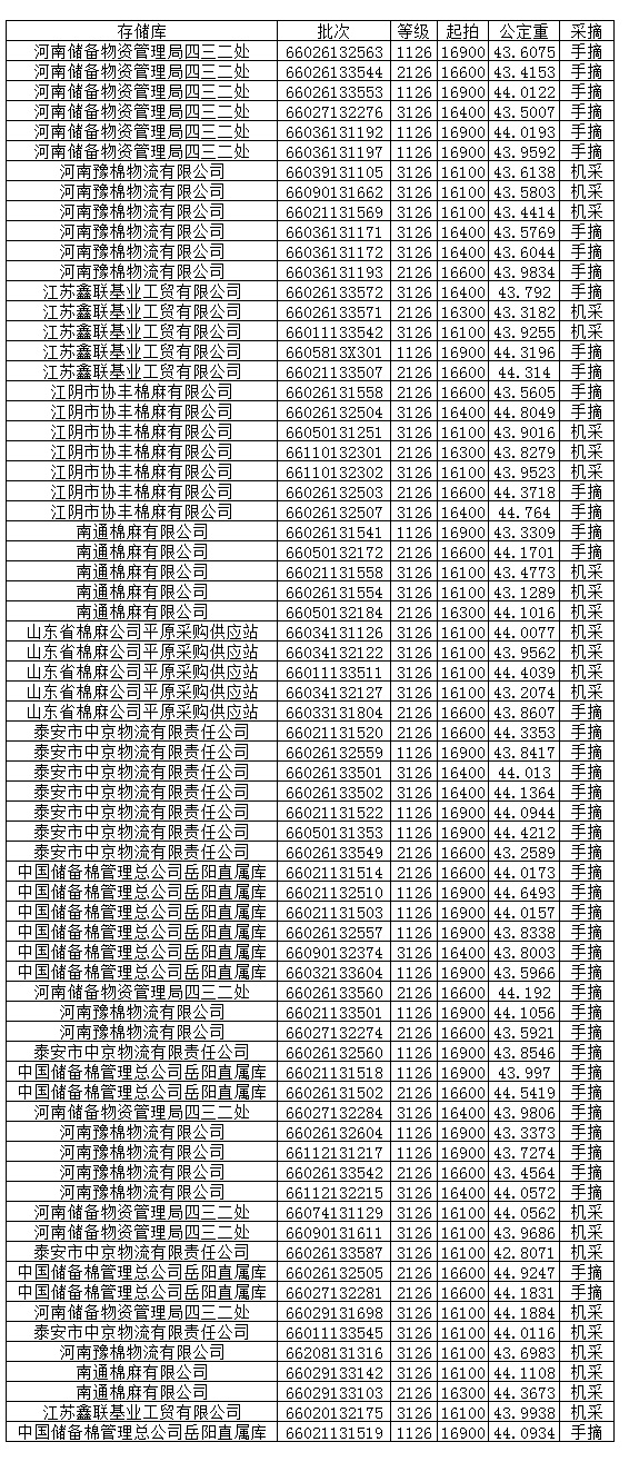 定于9月19日投放新疆兵團(tuán)競賣棉花3074.0707噸,存儲(chǔ)庫全為內(nèi)地庫區(qū)。相關(guān)批次公檢數(shù)據(jù)見附件。具體庫點(diǎn)如下: