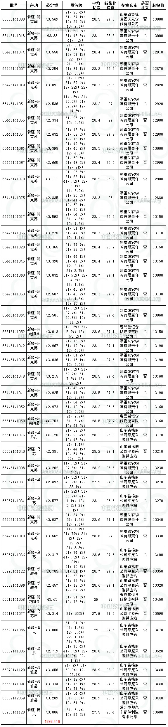 全國(guó)棉花交易市場(chǎng)定于10月15日上市新疆棉競(jìng)賣資源1898.416噸,全部為手摘棉,其中新疆庫(kù)區(qū)資源1119.982噸,最低起報(bào)價(jià)12820元/噸;內(nèi)地庫(kù)區(qū)資源778.434噸,最低起報(bào)價(jià)13000元/噸。當(dāng)日雙28以上資源(斷裂比強(qiáng)度28+,平均長(zhǎng)度28+)215.475噸,最低起報(bào)價(jià)為13210元/噸。