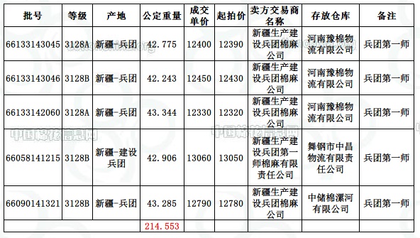 10月19日新疆棉競賣交易兵團(tuán)專場推出資源量為12944.405噸,(全部為兵團(tuán)第一師資源),實(shí)際成交214.553噸,成交率1.66%,最高成交價(jià)13060元/噸,最低成交價(jià)12330元/噸,成交平均價(jià)12606元/噸。平均長度28.30。中國棉花信息網(wǎng)統(tǒng)計(jì),截至10月19日,兵團(tuán)已累計(jì)成交資源41992.09噸。