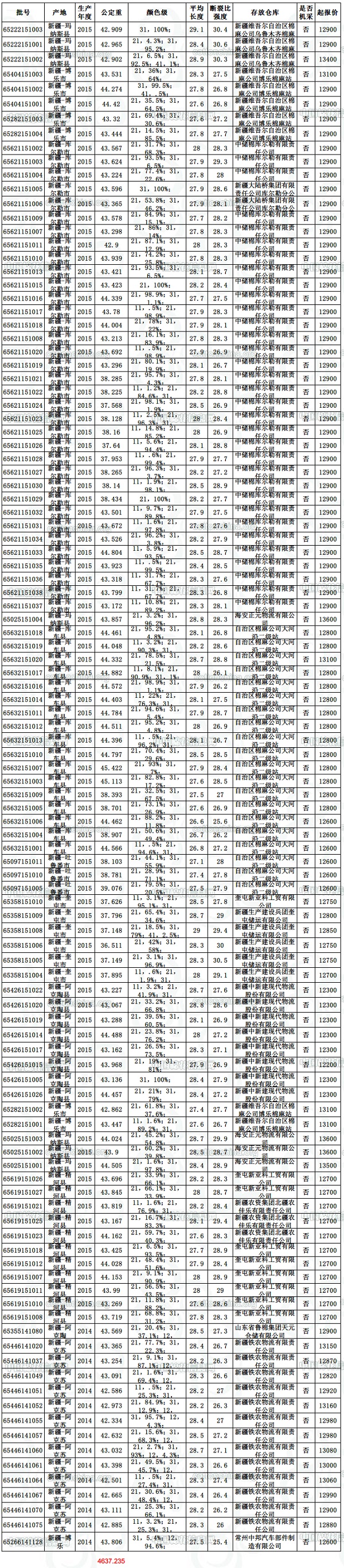全國(guó)棉花交易市場(chǎng)定于10月26日上市新疆棉競(jìng)賣資源4637.235噸,全部為手摘棉,其中新疆庫(kù)區(qū)資源4373.574噸,最低起報(bào)價(jià)12200元/噸;(2015年新資源占3815.747噸,最低起報(bào)價(jià)12200元/噸)。內(nèi)地庫(kù)區(qū)資源263.661噸,最低起報(bào)價(jià)12600元/噸;(2015年新資源占176.286噸,最低起報(bào)價(jià)13500元/噸)。當(dāng)日雙28以上資源(斷裂比強(qiáng)度28+,平均長(zhǎng)度28+)1387.828噸,最低起報(bào)價(jià)為12300元/噸。