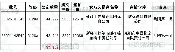 10月27日新疆棉競賣交易兵團專場推出資源量為11729.162噸,(全部為兵團第一師資源),實際成交87.168噸,成交率0.74%,成交均價12535元/噸,平均長度28.45。中國棉花信息網(wǎng)統(tǒng)計,截至10月27日,兵團已累計成交資源42992.773噸。