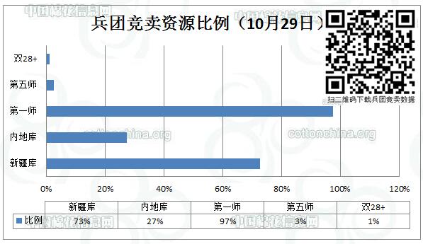 10月29日新疆生產(chǎn)建設(shè)兵團(tuán)競(jìng)賣專場(chǎng)推出棉花11775.773噸,其中第一師資源占11468.914噸,最低起報(bào)價(jià)12060元/噸;第五師資源占306.859噸,最低起報(bào)價(jià)11840元/噸。當(dāng)日雙28以上資源(斷裂比強(qiáng)度28+,平均長度28+)132.165噸,最低起報(bào)價(jià)12400元/噸。
