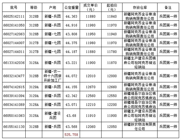 9月30日新疆棉競賣交易兵團專場推出資源量為17872.885噸,(全部為兵團第一師資源),實際成交525.758噸,成交率2.94%,最高成交價12670元/噸,最低成交價11880元/噸,成交均價12082.50元/噸,平均長度28.41。中國棉花信息網統(tǒng)計,截至9月30日,兵團已累計成交資源37374.818噸。