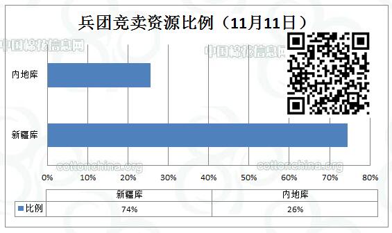 11月11日新疆生產(chǎn)建設(shè)兵團競賣專場推出棉花10027.61噸,全部第一師資源,最低起報價12060元/噸。新疆庫占7461.411噸,內(nèi)地庫占2566.201噸。當(dāng)日雙28以上資源(斷裂比強度28+,平均長度28+)43.516噸。