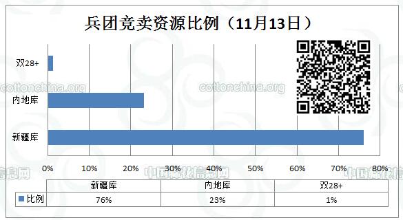 11月13日新疆生產(chǎn)建設(shè)兵團(tuán)競(jìng)賣專場(chǎng)推出棉花9723.162噸,全部第一師資源,最低起報(bào)價(jià)12060元/噸。新疆庫(kù)占7461.411噸,內(nèi)地庫(kù)占2261.751噸。當(dāng)日雙28以上資源(斷裂比強(qiáng)度28+,平均長(zhǎng)度28+)132.165噸。