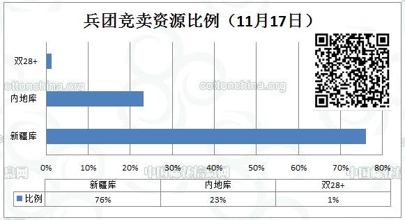 11月17日新疆生產(chǎn)建設(shè)兵團(tuán)競賣專場推出棉花9723.162噸,全部第一師資源,最低起報價12060元/噸。新疆庫占7461.411噸,內(nèi)地庫占2261.751噸。當(dāng)日雙28以上資源(斷裂比強(qiáng)度28+,平均長度28+)132.165噸。