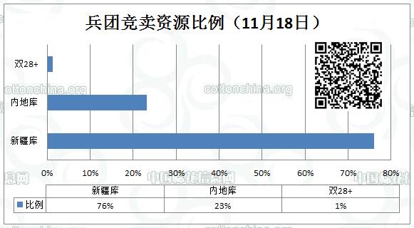 11月18日新疆生產建設兵團競賣專場推出棉花9723.162噸,全部第一師資源,最低起報價12060元/噸。新疆庫占7461.411噸,內地庫占2261.751噸。當日雙28以上資源(斷裂比強度28+,平均長度28+)132.165噸。