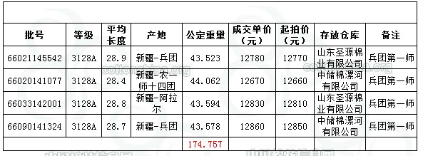 11月2日新疆棉競(jìng)賣交易兵團(tuán)專場(chǎng)推出資源量為11515.14噸,實(shí)際成交174.757噸(均為第一師資源),成交率1.52%,最高成交價(jià)12860元/噸,最低成交價(jià)12670元/噸,成交均價(jià)12785元/噸,平均長(zhǎng)度28.70。中國(guó)棉花信息網(wǎng)統(tǒng)計(jì),截至11月2日,兵團(tuán)已累計(jì)成交資源43601.24噸。