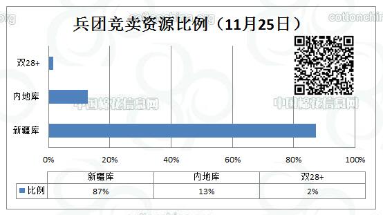 11月25日新疆生產(chǎn)建設(shè)兵團(tuán)競(jìng)賣專場(chǎng)推出棉花8504.05噸,全部第一師資源,最低起報(bào)價(jià)12130元/噸。新疆庫(kù)占7418.31噸,內(nèi)地庫(kù)占1085.74噸。當(dāng)日雙28以上資源(斷裂比強(qiáng)度28+,平均長(zhǎng)度28+)132.165噸。