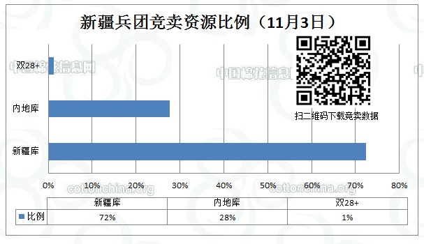 11月3日新疆生產(chǎn)建設兵團競賣專場推出棉花11033.527噸,全部第一師資源,最低起報價12060元/噸。當日雙28以上資源(斷裂比強度28+,平均長度28+)132.165噸,最低起報價12400元/噸。