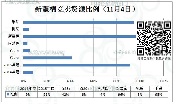 全國棉花交易市場定于11月4日上市新疆棉競賣資源4954.142噸。其中新疆庫區(qū)資源4779.906噸,內(nèi)地庫區(qū)資源174.236噸。當日雙28以上資源(斷裂比強度28+,平均長度28+)2066.411噸,雙29以上資源占289.886噸。當日新疆庫新增5批2015年度資源209.535噸,其中機采最低起報價12100元/噸,手采最低起報價12600元/噸。