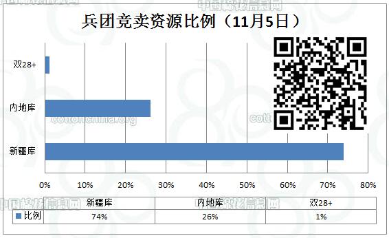 11月5日新疆生產(chǎn)建設(shè)兵團(tuán)競(jìng)賣專場(chǎng)推出棉花10683.74噸,全部第一師資源,最低起報(bào)價(jià)12060元/噸。新疆庫占7897.247噸,內(nèi)地庫占2786.493噸。當(dāng)日雙28以上資源(斷裂比強(qiáng)度28+,平均長(zhǎng)度28+)132.165噸,最低起報(bào)價(jià)12400元/噸。