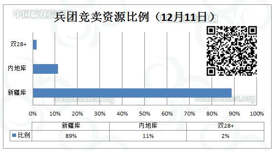 12月11日新疆生產(chǎn)建設(shè)兵團競賣專場推出棉花7331.046噸,全部第一師資源,最低起報價12130元/噸。新疆庫占6506.015噸,內(nèi)地庫占825.031噸。當(dāng)日雙28以上資源(斷裂比強度28+,平均長度28+)132.165噸。