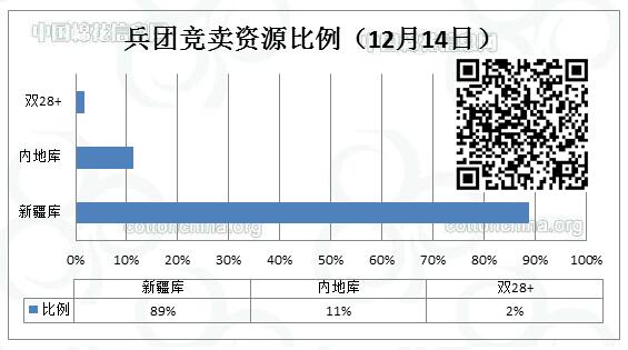 12月14日新疆生產(chǎn)建設(shè)兵團(tuán)競(jìng)賣(mài)專(zhuān)場(chǎng)推出棉花7331.046噸,全部第一師資源,最低起報(bào)價(jià)12130元/噸。新疆庫(kù)占6506.015噸,內(nèi)地庫(kù)占825.031噸。當(dāng)日雙28以上資源(斷裂比強(qiáng)度28+,平均長(zhǎng)度28+)132.165噸。