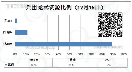 12月16日新疆生產(chǎn)建設(shè)兵團競賣專場推出棉花7287.554噸,全部第一師資源,最低起報價12130元/噸。新疆庫占6506.015噸,內(nèi)地庫占781.539噸。當(dāng)日雙28以上資源(斷裂比強度28+,平均長度28+)132.165噸。
