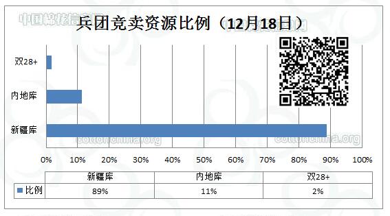 12月18日新疆生產(chǎn)建設(shè)兵團競賣專場推出棉花7070.544噸,全部第一師資源,最低起報價12130元/噸。新疆庫占6332.257噸,內(nèi)地庫占738.287噸。當(dāng)日雙28以上資源(斷裂比強度28+,平均長度28+)132.165噸。