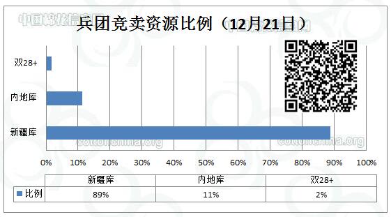 12月18日新疆生產(chǎn)建設(shè)兵團(tuán)競(jìng)賣專場(chǎng)推出棉花7070.544噸,全部第一師資源,最低起報(bào)價(jià)12130元/噸。新疆庫(kù)占6332.257噸,內(nèi)地庫(kù)占738.287噸。當(dāng)日雙28以上資源(斷裂比強(qiáng)度28+,平均長(zhǎng)度28+)132.165噸。