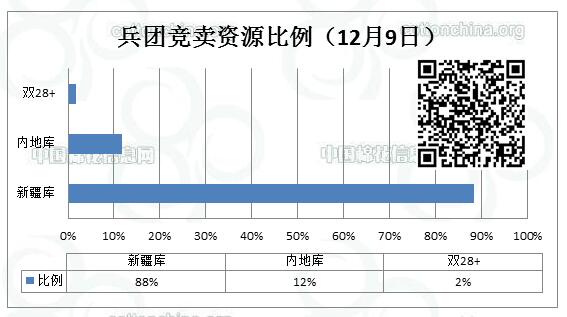 12月9日新疆生產建設兵團競賣專場推出棉花7419.393噸,全部第一師資源,最低起報價12130元/噸。新疆庫占6550.387噸,內地庫占869.006噸。當日雙28以上資源(斷裂比強度28+,平均長度28+)132.165噸。