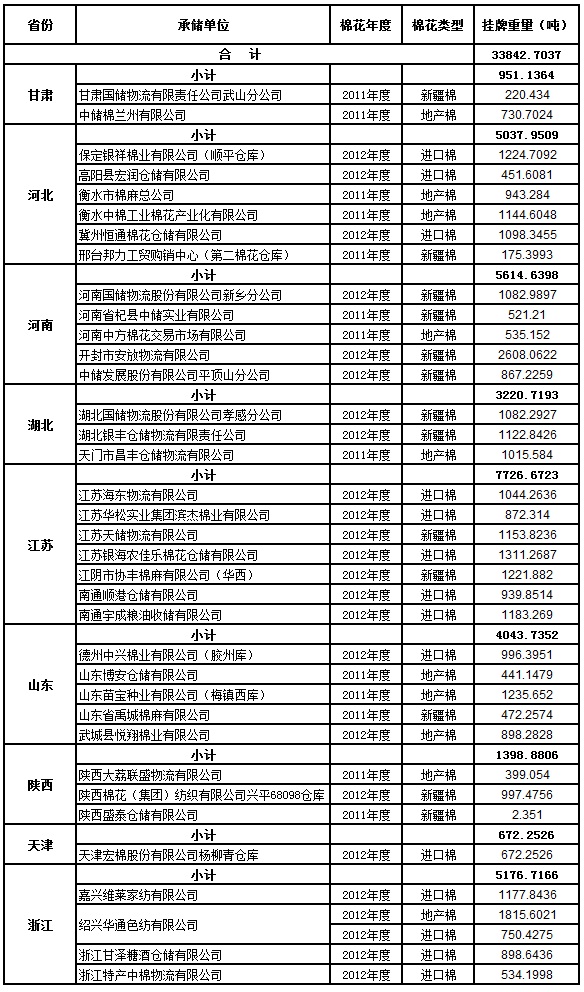 定于7月13日出庫銷售儲備棉33842.7037噸。其中2012年度國產(chǎn)棉12850.4792噸,2012年度進(jìn)口棉13155.3917噸;2011年度國產(chǎn)棉7836.8328噸。相關(guān)批次公檢數(shù)據(jù)見附件。具體庫點如下: