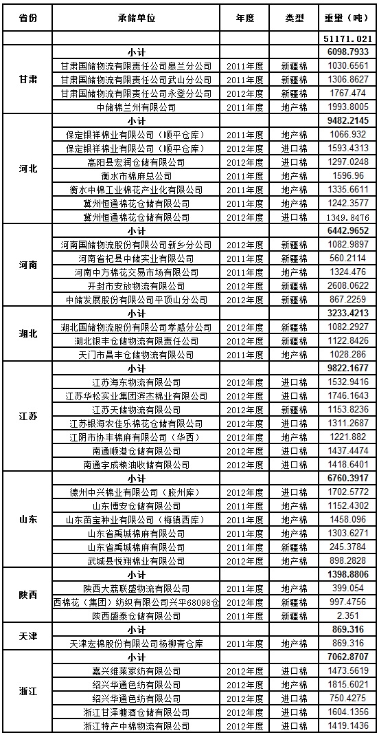 定于7月17日出庫(kù)銷(xiāo)售儲(chǔ)備棉51171.021噸。其中2012年度國(guó)產(chǎn)棉14617.9532噸(最低起拍價(jià)12790元/噸,捆號(hào)47500112513),2012年度進(jìn)口棉18636.6116噸(最低起拍價(jià)13980元/噸,捆號(hào)分別為31450112021和31420012037);2011年度國(guó)產(chǎn)棉17916.4562噸(最低起拍價(jià)10670元/噸,捆號(hào)30000211314)。相關(guān)批次公檢數(shù)據(jù)見(jiàn)附件。具體庫(kù)點(diǎn)如下: