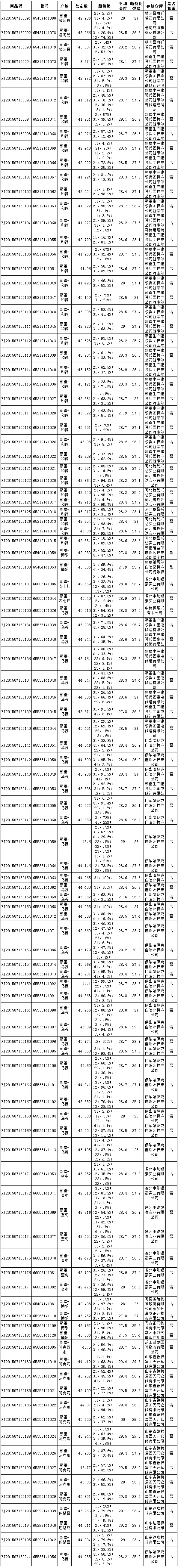 全國棉花交易市場定于7月17日上市新疆棉競賣資源5740.605噸,其中新疆庫區(qū)資源3967.847噸(手摘棉3881.828噸,最低起報價12640元/噸;機采棉86.019噸,最低起報價12300元/噸)。內(nèi)地庫區(qū)資源1772.758噸,最低起報價12900元/噸。當日雙28以上資源(斷裂比強度28+,平均長度28+)2578.141噸(新疆庫占1750.55噸,最低起報價13000元/噸;內(nèi)地庫占827.591噸,最低起報價13200元/噸;均為手摘棉。