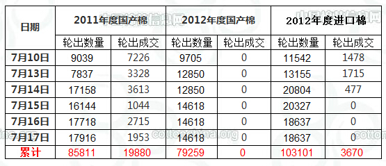 7月17日儲備棉輪出數(shù)量為51171.021噸,實際成交1952.9304噸,成交比例3.82%。當(dāng)日成交均為2011年度國產(chǎn)棉,平均長度28.8,參與涉及競買成功的企業(yè)共計8家。據(jù)中國棉花信息網(wǎng)統(tǒng)計,截至7月17日儲備棉輪出累計成交23550.734噸,成交比例8.78%。