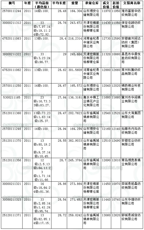 一、最高成交價(jià)13060元/噸,共計(jì)259.0242噸,承儲(chǔ)在山東省禹城棉麻有限公司(2011年度國產(chǎn)棉)。最低成交價(jià)11320元/噸,共計(jì)245.664噸,承儲(chǔ)在天津宏棉股份有限公司楊柳青倉庫(2011年度國產(chǎn)棉)。