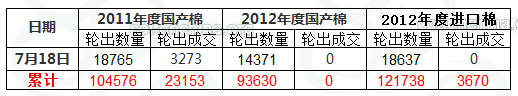 7月20日儲(chǔ)備棉輪出數(shù)量為51772.5758噸,實(shí)際成交3273.0006噸,成交比例6.32%。當(dāng)日成交均為2011年度國產(chǎn)棉,平均長度28.8,參與涉及競買成功的企業(yè)共計(jì)14家。據(jù)中國棉花信息網(wǎng)統(tǒng)計(jì),截至7月20日儲(chǔ)備棉輪出累計(jì)成交26823.7346噸,成交比例8.38%。