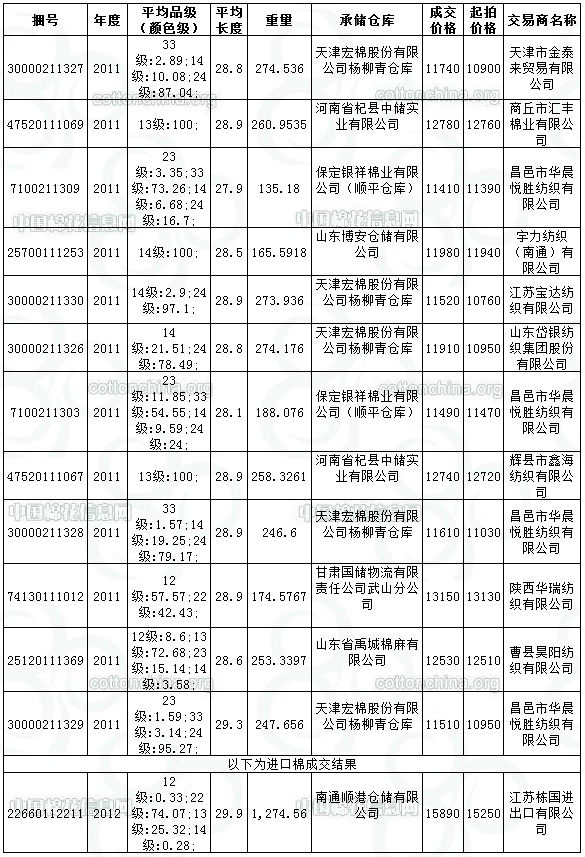 一、最高成交價(jià)15890元/噸,共計(jì)1274.5568噸,承儲(chǔ)在南通順港倉儲(chǔ)有限公司(2012年度進(jìn)口棉)。最低成交價(jià)11410元/噸,共計(jì)135.1800噸,承儲(chǔ)在保定銀祥棉業(yè)有限公司(順平倉庫)(2011年度國(guó)產(chǎn)棉)。