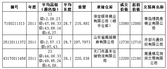 一、最高成交價12730元/噸,共計297.7973噸,承儲在山東省禹城棉麻有限公司(2011年度國產(chǎn)棉)。最低成交價12080元/噸,共計215.8920噸,承儲在保定銀祥棉業(yè)有限公司(順平倉庫)(2011年度國產(chǎn)棉)。