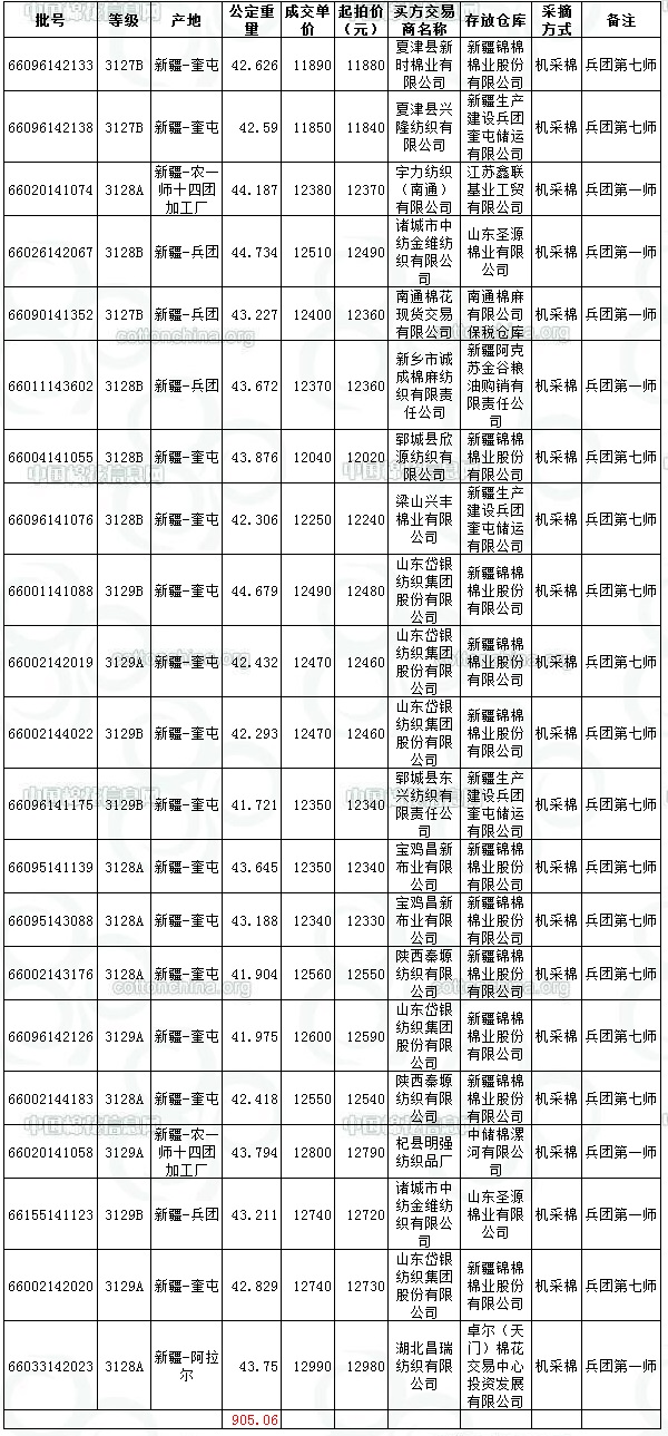 7月29日新疆棉競(jìng)賣交易兵團(tuán)專場(chǎng)推出資源量為20031.15噸,實(shí)際成交905.06噸,成交率4.51%,最高成交價(jià)12990元/噸,最低成交價(jià)11850元/噸,成交均價(jià)12435元/噸,平均長(zhǎng)度28.64。