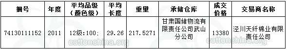 一、最高成交價(jià)13380元/噸,共計(jì)217.5271噸,承儲(chǔ)在甘肅國(guó)儲(chǔ)物流有限責(zé)任公司武山分公司(2011年度國(guó)產(chǎn)棉)。
