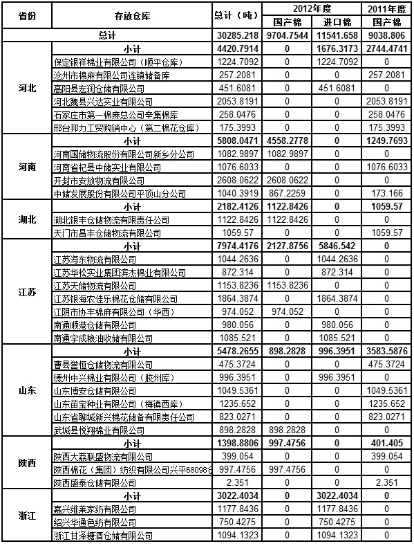 定于7月10日出庫銷售儲備棉30285.2182噸。其中2012年度國產(chǎn)棉9704.7544噸,2012年度進(jìn)口棉11541.6578噸;2011年度國產(chǎn)棉9038.806噸。相關(guān)批次公檢數(shù)據(jù)見附件。具體庫點(diǎn)如下: