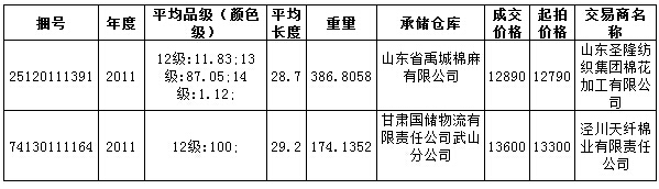2011年度國(guó)產(chǎn)棉最高成交價(jià):13600元/噸,最低成交價(jià):12890元/噸,平均成交價(jià):13245元/噸,折3128B價(jià)13400元/噸。平均長(zhǎng)度29。