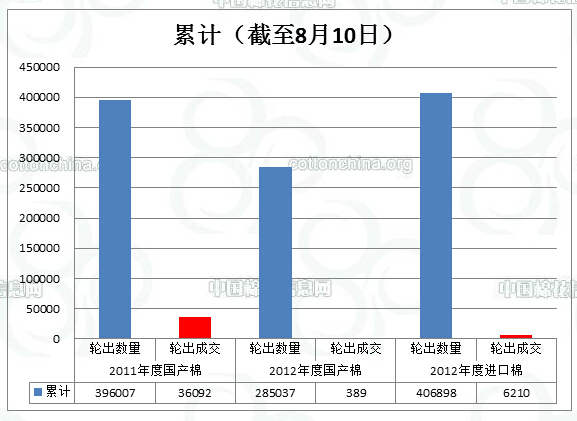 8月10日儲(chǔ)備棉輪出數(shù)量為50576.0414噸,實(shí)際成交560.941噸,成交比例1.11%。參與涉及競(jìng)買成功的企業(yè)共計(jì)2家。據(jù)中國(guó)棉花信息網(wǎng)統(tǒng)計(jì),截至8月10日儲(chǔ)備棉輪出累計(jì)成交42690.685噸,成交比例3.92%。