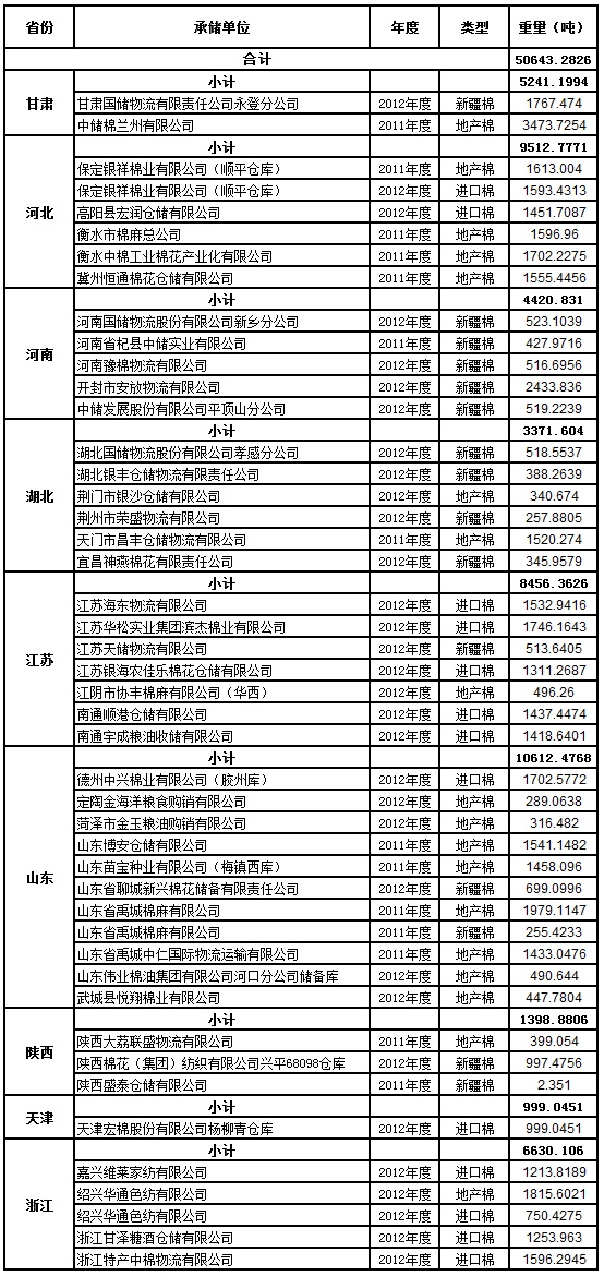 定于8月11日出庫(kù)銷(xiāo)售儲(chǔ)備棉50643.2826噸。其中2012年度國(guó)產(chǎn)棉13677.7114噸(最低起拍價(jià)12790元/噸,捆號(hào)47500112513),2012年度進(jìn)口棉18007.7283噸(最低起拍價(jià)13560元/噸,捆號(hào)分別為30000212104);2011年度國(guó)產(chǎn)棉18957.8429噸(最低起拍價(jià)11600元/噸,捆號(hào)43170011462)。相關(guān)批次公檢數(shù)據(jù)見(jiàn)附件。具體庫(kù)點(diǎn)如下: