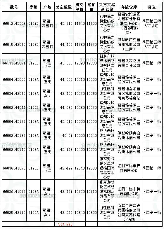 8月12日兵團(tuán)棉競賣交易成交結(jié)果