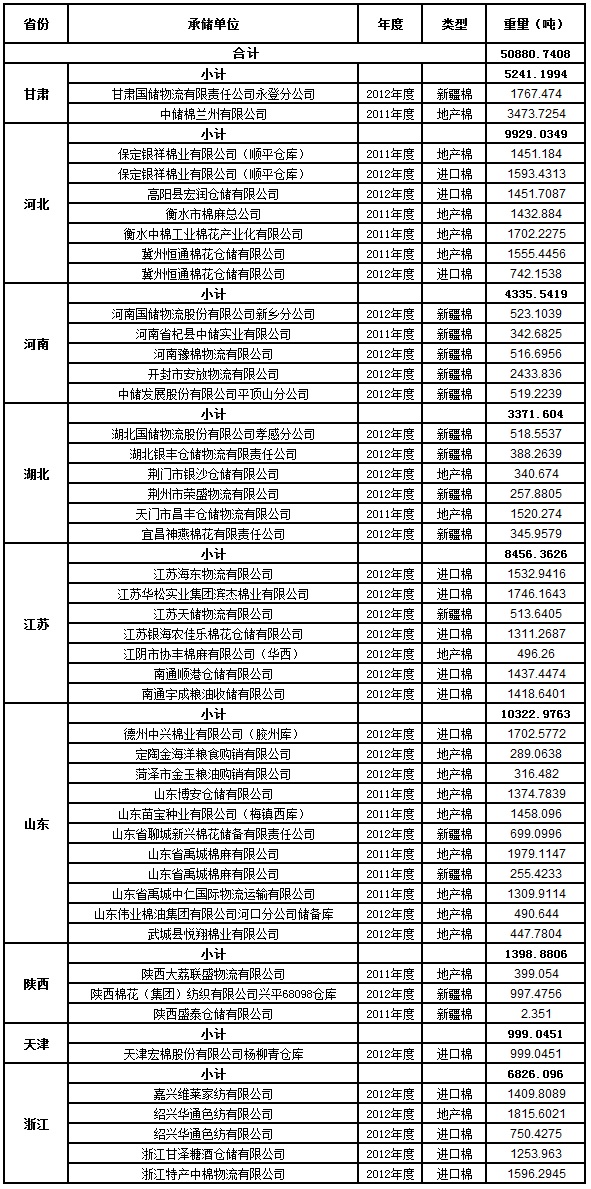 定于8月13日出庫銷售儲(chǔ)備棉50880.7408噸。其中2012年度國產(chǎn)棉13677.7114噸(最低起拍價(jià)12790元/噸,捆號(hào)47500112513),2012年度進(jìn)口棉18945.8721噸(最低起拍價(jià)13560元/噸,捆號(hào)分別為30000212104);2011年度國產(chǎn)棉18257.1573噸(最低起拍價(jià)11600元/噸,捆號(hào)43170011462)。相關(guān)批次公檢數(shù)據(jù)見附件。具體庫點(diǎn)如下: