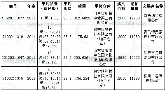 2011年度國產(chǎn)棉最高成交價(jià):12920元/噸,最低成交價(jià):12000元/噸,平均成交價(jià):12433元/噸,折3128B價(jià)13240元/噸。平均長度28.8。