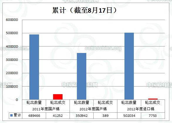 8月17日儲(chǔ)備棉輪出數(shù)量為50230.5944噸,實(shí)際成交1175.4494噸,成交比例2.34%。參與涉及競(jìng)買成功的企業(yè)共計(jì)5家。據(jù)中國(guó)棉花信息網(wǎng)統(tǒng)計(jì),截至8月17日儲(chǔ)備棉輪出累計(jì)成交49393.0006噸,成交比例2.38%。