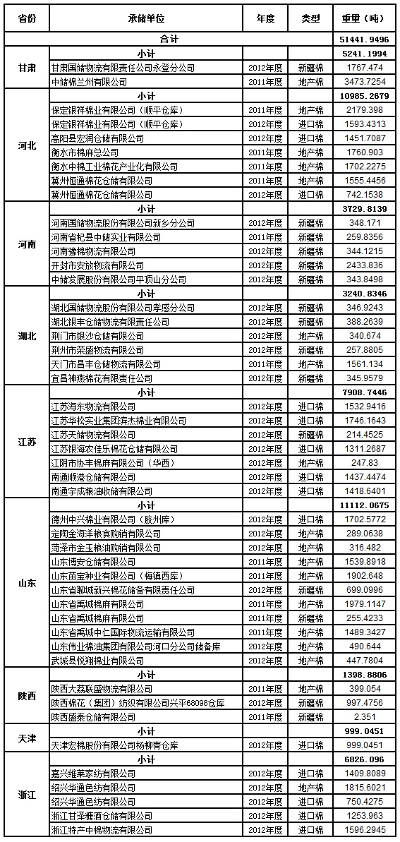 定于8月18日出庫銷售儲備棉51441.9496噸。其中2012年度國產(chǎn)棉12435.5829噸(最低起拍價12790元/噸,捆號47500112513),2012年度進(jìn)口棉18945.8721噸(最低起拍價13560元/噸,捆號分別為30000212104);2011年度國產(chǎn)棉20060.4946噸(最低起拍價11600元/噸,捆號43170011462)。相關(guān)批次公檢數(shù)據(jù)見附件。具體庫點(diǎn)如下: