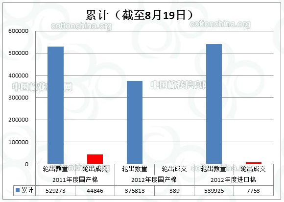 8月19日儲備棉輪出數(shù)量為51128.5103噸,實際成交1526.4402噸,當日成交比例2.99%。參與涉及競買成功的企業(yè)共計7家。據(jù)中國棉花信息網(wǎng)統(tǒng)計,截至8月19日儲備棉輪出累計成交52986.5625噸,成交比例3.67%。