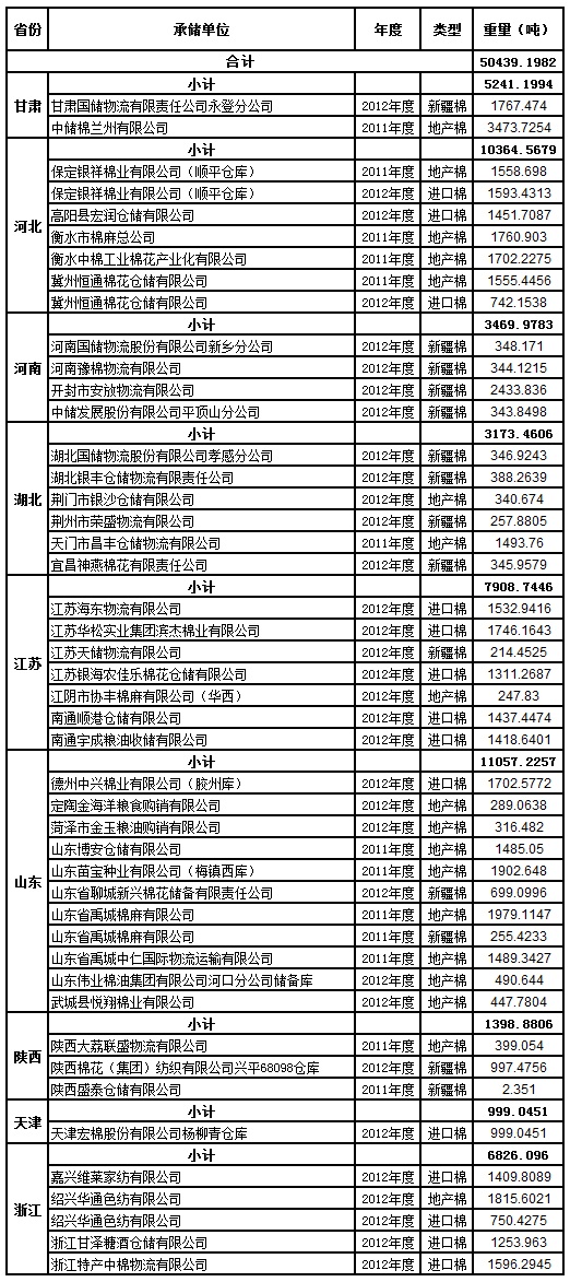定于8月20日出庫(kù)銷售儲(chǔ)備棉50439.1982噸。其中2012年度國(guó)產(chǎn)棉12435.5829噸(最低起拍價(jià)12790元/噸,捆號(hào)47500112513),2012年度進(jìn)口棉18945.8721噸(最低起拍價(jià)13560元/噸,捆號(hào)分別為30000212104);2011年度國(guó)產(chǎn)棉19057.7432噸(最低起拍價(jià)11660元/噸,捆05300311364)。相關(guān)批次公檢數(shù)據(jù)見附件。具體庫(kù)點(diǎn)如下: