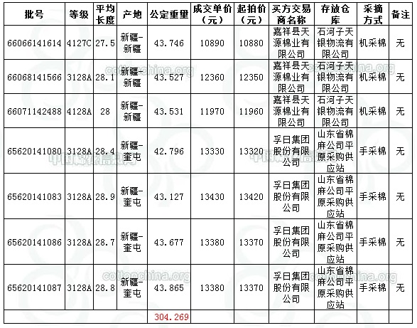 當(dāng)日成交資源7批,實(shí)際成交家數(shù)2家。資源分別存放在石河子天銀物流有限公司(機(jī)采棉)和山東省棉麻公司平原采購(gòu)供應(yīng)站(手采棉);每批底價(jià)均加價(jià)10元成交。