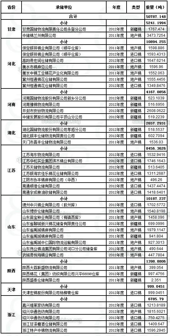 定于8月3日出庫(kù)銷售儲(chǔ)備棉50787.1483噸。其中2012年度國(guó)產(chǎn)棉12516.3249噸(最低起拍價(jià)12790元/噸,捆號(hào)47500112513),2012年度進(jìn)口棉19709.1726噸(最低起拍價(jià)13560元/噸,捆號(hào)分別為30000212104);2011年度國(guó)產(chǎn)棉18561.6508噸(最低起拍價(jià)11660元/噸,捆號(hào)05300311364)。相關(guān)批次公檢數(shù)據(jù)見(jiàn)附件。具體庫(kù)點(diǎn)如下: