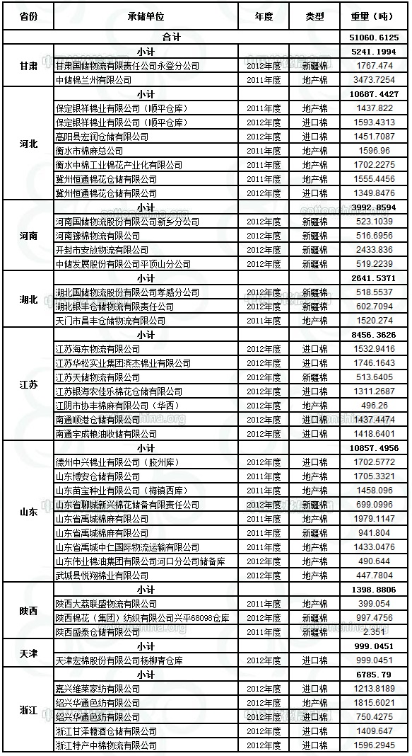 定于8月5日出庫(kù)銷售儲(chǔ)備棉51060.6125噸。其中2012年度國(guó)產(chǎn)棉12342.0987噸(最低起拍價(jià)12790元/噸,捆號(hào)47500112513),2012年度進(jìn)口棉19513.2599噸(最低起拍價(jià)13560元/噸,捆號(hào)分別為30000212104);2011年度國(guó)產(chǎn)棉19205.2539噸(最低起拍價(jià)11400元/噸,捆號(hào)07100211321)。相關(guān)批次公檢數(shù)據(jù)見(jiàn)附件。具體庫(kù)點(diǎn)如下: